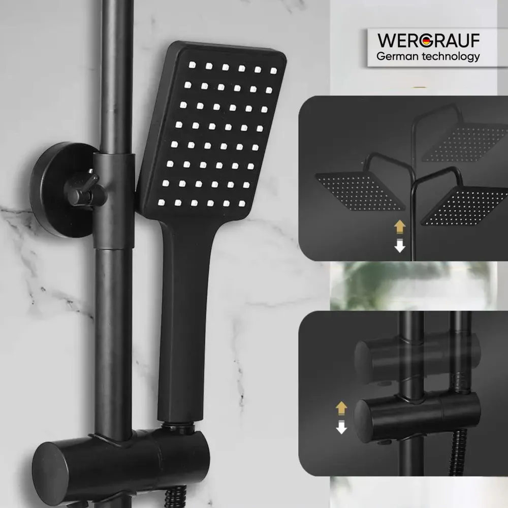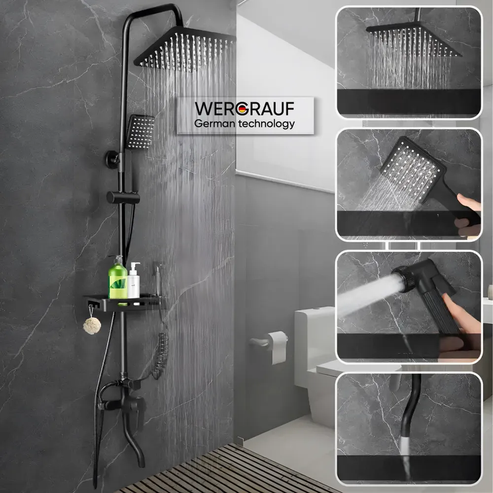 Душевая система с тропическим душем - это практичное и современное решение для ванной комнаты. Данная модель отлично впишется в любой интерьер. Душевая система изготовлена из высококачественной и экологически безопасной латуни и нержавеющей стали. А специальное износостойкое матовое покрытие защитит поверхность от ржавчины. За счет этих факторов система не потеряет свой внешний вид и прослужит долгое время. Тропический душ и душевая лейка выполнены из высококачественного ABS-пластика класса А. В подарок к душевой системе идёт съемная полочка, которую можно использовать для ванных принадлежностей. Наклон тропического душа регулируется за счёт шарнирно-поворотного крепления. Душевой гарнитур интуитивно просто собирается. В комплекте есть все для установки, включая крепления.